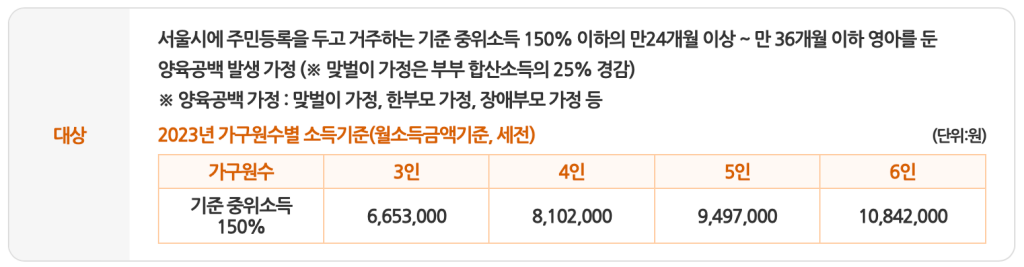 - 양육 공백이 발생하는 만 24~36개월 이하의 영아를 키우는 중위소득 150% 이하의 가정.