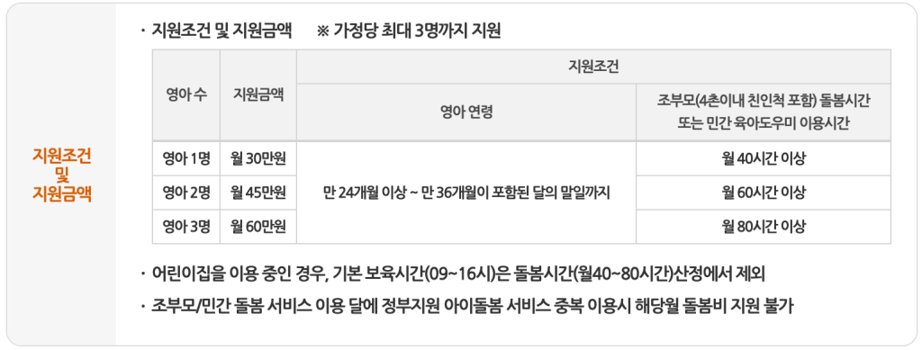 - 영아 3명 기준 월 60만원 지원 (월 80시간 이상 돌봄 시)
