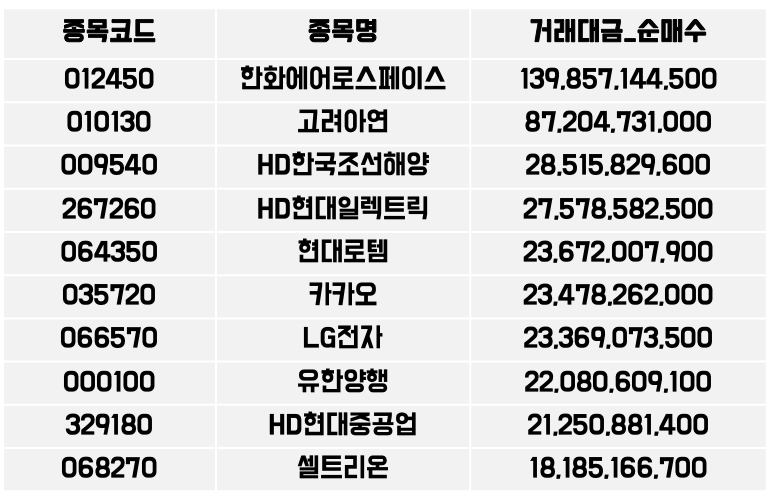 지난 한 주 외국인이 가장 많이 산 주식 코스피 기준 10월 1주차(9월 30일 ~ 10월 1일)