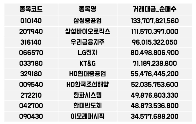 지난 한 주 외국인이 가장 많이 산 주식 코스피 기준 7월 마지막주차(7월 29일 ~8월 2일)