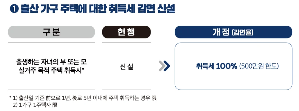 행정안전부는 2023년 지방세제개편안 민생안정지원의 내용으로 출산 자녀와 함께 거주할 목적으로 주택을 취득하는 경우 취득세를 감면받을 수 있도록 출산 가구 주택에 대한 취득세 감면 신설을 발표하였고, 8월18일부터 9월 18일까지 입법예고 하였습니다.